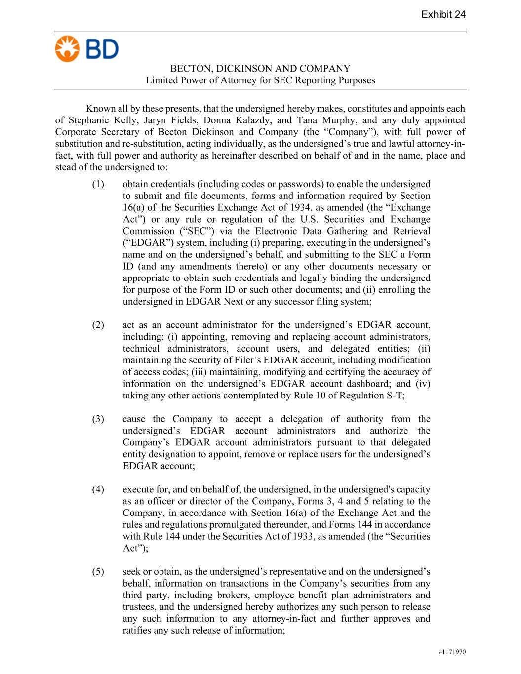 BECTON, DICKINSON AND COMPANY Limited Power of Attorney for SEC Reporting Purposes #1171970 Known all by these presents, that the undersigned hereby makes, constitutes and appoints each of Stephanie Kelly, Jaryn Fields, Donna Kalazdy, and Tana Murphy, and any duly appointed Corporate Secretary of Becton Dickinson and Company (the “Company”), with full power of substitution and re-substitution, acting individually, as the undersigned’s true and lawful attorney-in- fact, with full power and authority as hereinafter described on behalf of and in the name, place and stead of the undersigned to: (1) obtain credentials (including codes or passwords) to enable the undersigned to submit and file documents, forms and information required by Section 16(a) of the Securities Exchange Act of 1934, as amended (the “Exchange Act”) or any rule or regulation of the U.S. Securities and Exchange Commission (“SEC”) via the Electronic Data Gathering and Retrieval (“EDGAR”) system, including (i) preparing, executing in the undersigned’s name and on the undersigned’s behalf, and submitting to the SEC a Form ID (and any amendments thereto) or any other documents necessary or appropriate to obtain such credentials and legally binding the undersigned for purpose of the Form ID or such other documents; and (ii) enrolling the undersigned in EDGAR Next or any successor filing system; (2) act as an account administrator for the undersigned’s EDGAR account, including: (i) appointing, removing and replacing account administrators, technical administrators, account users, and delegated entities; (ii) maintaining the security of Filer’s EDGAR account, including modification of access codes; (iii) maintaining, modifying and certifying the accuracy of information on the undersigned’s EDGAR account dashboard; and (iv) taking any other actions contemplated by Rule 10 of Regulation S-T; (3) cause the Company to accept a delegation of authority from the undersigned’s EDGAR account administrators and authorize the Company’s EDGAR account administrators pursuant to that delegated entity designation to appoint, remove or replace users for the undersigned’s EDGAR account; (4) execute for, and on behalf of, the undersigned, in the undersigned's capacity as an officer or director of the Company, Forms 3, 4 and 5 relating to the Company, in accordance with Section 16(a) of the Exchange Act and the rules and regulations promulgated thereunder, and Forms 144 in accordance with Rule 144 under the Securities Act of 1933, as amended (the “Securities Act”); (5) seek or obtain, as the undersigned’s representative and on the undersigned’s behalf, information on transactions in the Company’s securities from any third party, including brokers, employee benefit plan administrators and trustees, and the undersigned hereby authorizes any such person to release any such information to any attorney-in-fact and further approves and ratifies any such release of information; Exhibit 24