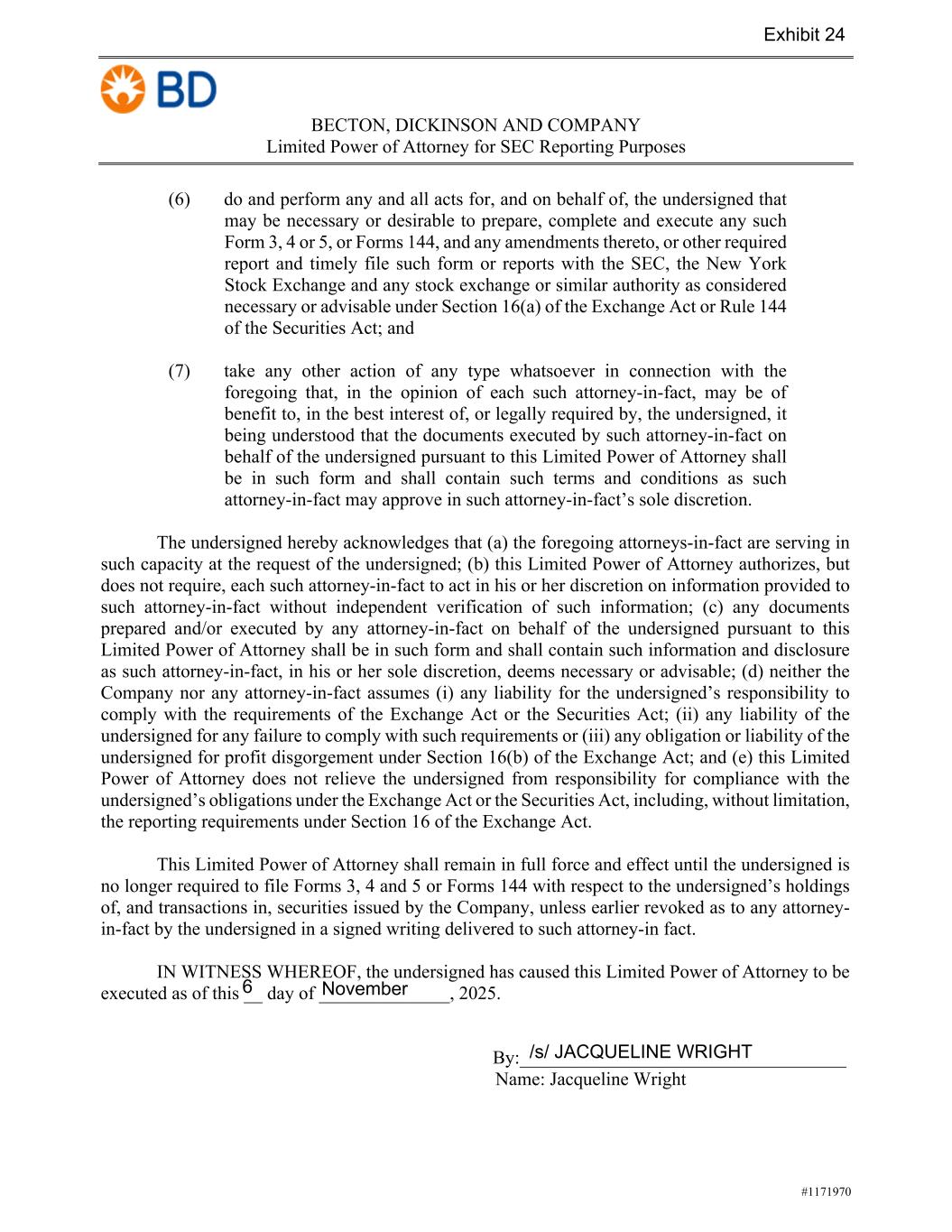 BECTON, DICKINSON AND COMPANY Limited Power of Attorney for SEC Reporting Purposes #1171970 (6) do and perform any and all acts for, and on behalf of, the undersigned that may be necessary or desirable to prepare, complete and execute any such Form 3, 4 or 5, or Forms 144, and any amendments thereto, or other required report and timely file such form or reports with the SEC, the New York Stock Exchange and any stock exchange or similar authority as considered necessary or advisable under Section 16(a) of the Exchange Act or Rule 144 of the Securities Act; and (7) take any other action of any type whatsoever in connection with the foregoing that, in the opinion of each such attorney-in-fact, may be of benefit to, in the best interest of, or legally required by, the undersigned, it being understood that the documents executed by such attorney-in-fact on behalf of the undersigned pursuant to this Limited Power of Attorney shall be in such form and shall contain such terms and conditions as such attorney-in-fact may approve in such attorney-in-fact’s sole discretion. The undersigned hereby acknowledges that (a) the foregoing attorneys-in-fact are serving in such capacity at the request of the undersigned; (b) this Limited Power of Attorney authorizes, but does not require, each such attorney-in-fact to act in his or her discretion on information provided to such attorney-in-fact without independent verification of such information; (c) any documents prepared and/or executed by any attorney-in-fact on behalf of the undersigned pursuant to this Limited Power of Attorney shall be in such form and shall contain such information and disclosure as such attorney-in-fact, in his or her sole discretion, deems necessary or advisable; (d) neither the Company nor any attorney-in-fact assumes (i) any liability for the undersigned’s responsibility to comply with the requirements of the Exchange Act or the Securities Act; (ii) any liability of the undersigned for any failure to comply with such requirements or (iii) any obligation or liability of the undersigned for profit disgorgement under Section 16(b) of the Exchange Act; and (e) this Limited Power of Attorney does not relieve the undersigned from responsibility for compliance with the undersigned’s obligations under the Exchange Act or the Securities Act, including, without limitation, the reporting requirements under Section 16 of the Exchange Act. This Limited Power of Attorney shall remain in full force and effect until the undersigned is no longer required to file Forms 3, 4 and 5 or Forms 144 with respect to the undersigned’s holdings of, and transactions in, securities issued by the Company, unless earlier revoked as to any attorney- in-fact by the undersigned in a signed writing delivered to such attorney-in fact. IN WITNESS WHEREOF, the undersigned has caused this Limited Power of Attorney to be executed as of this __ day of ______________, 2025. By:___________________________________ Name: Jacqueline Wright 6 November /s/ JACQUELINE WRIGHT Exhibit 24